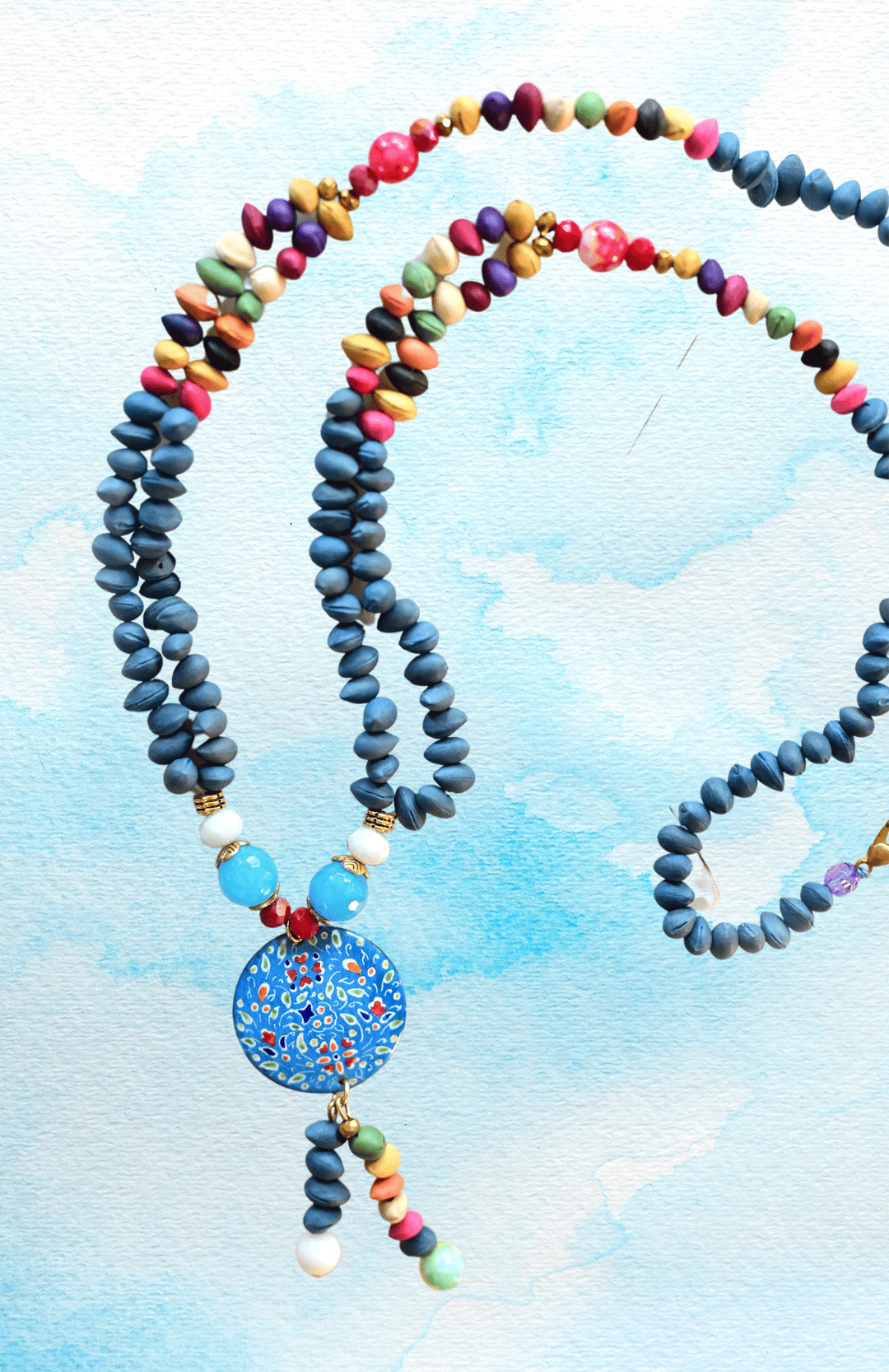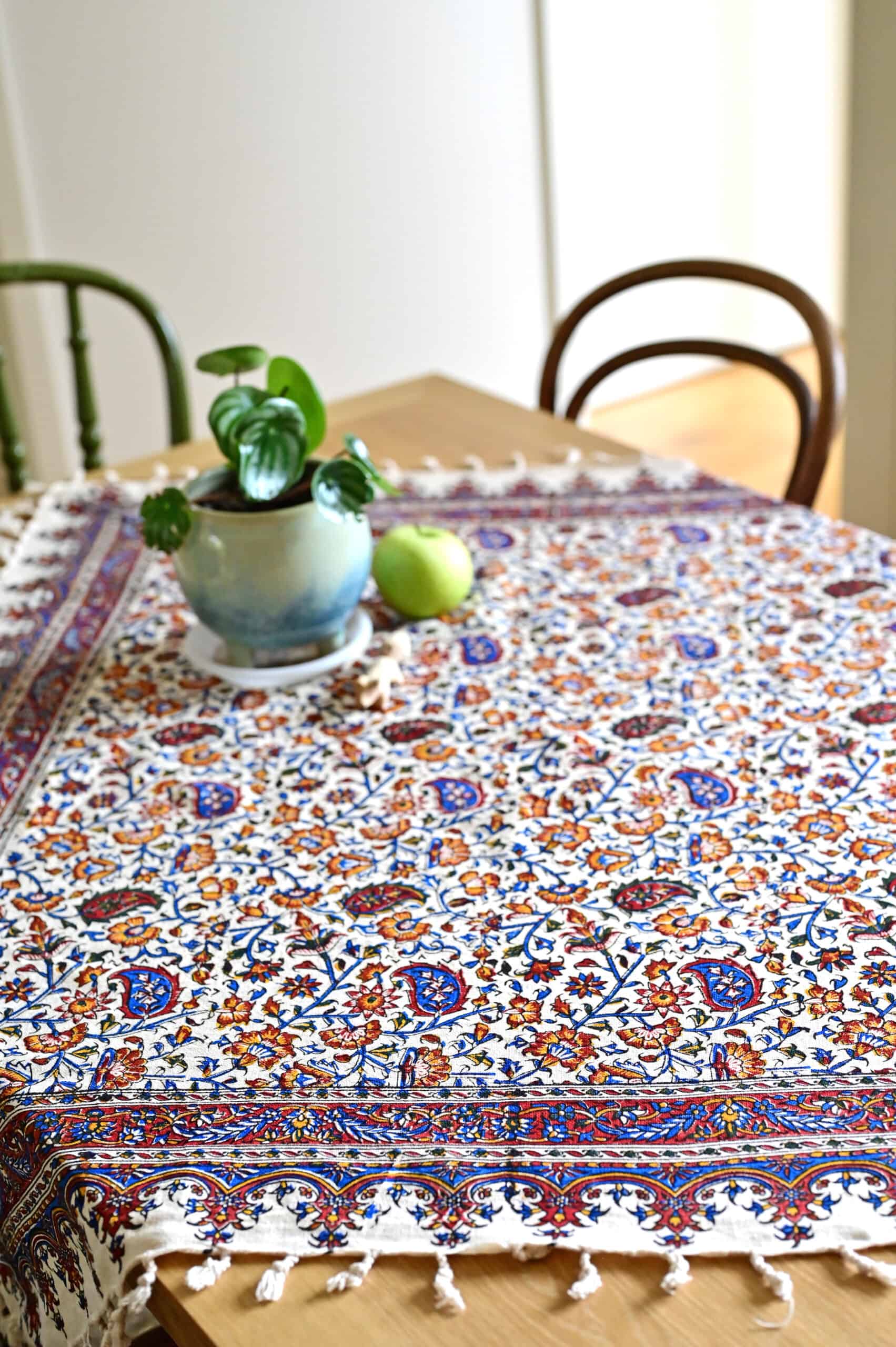 Termeh is typically made from natural fibbers such as silk, wool, or both. The fabric often features intricate designs and motifs, including paisley patterns, floral motifs, and geometric shapes.