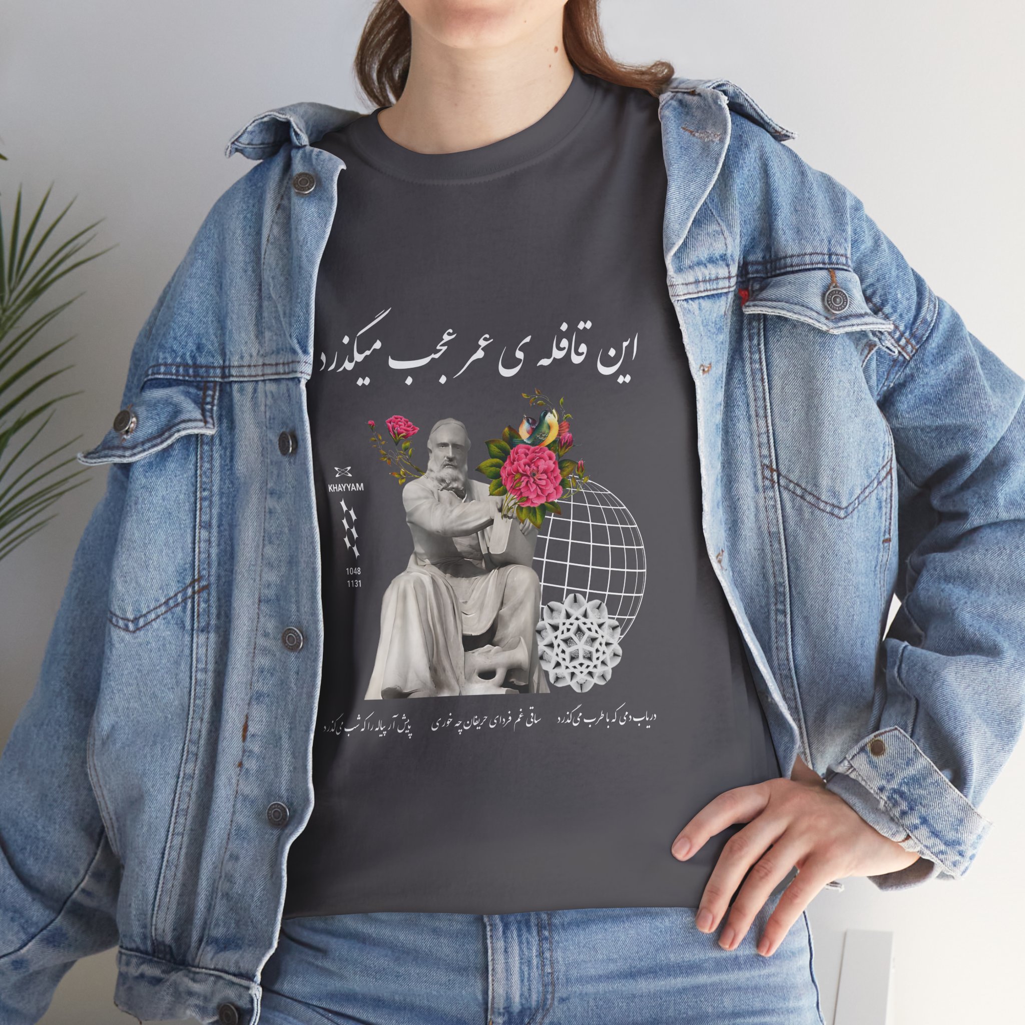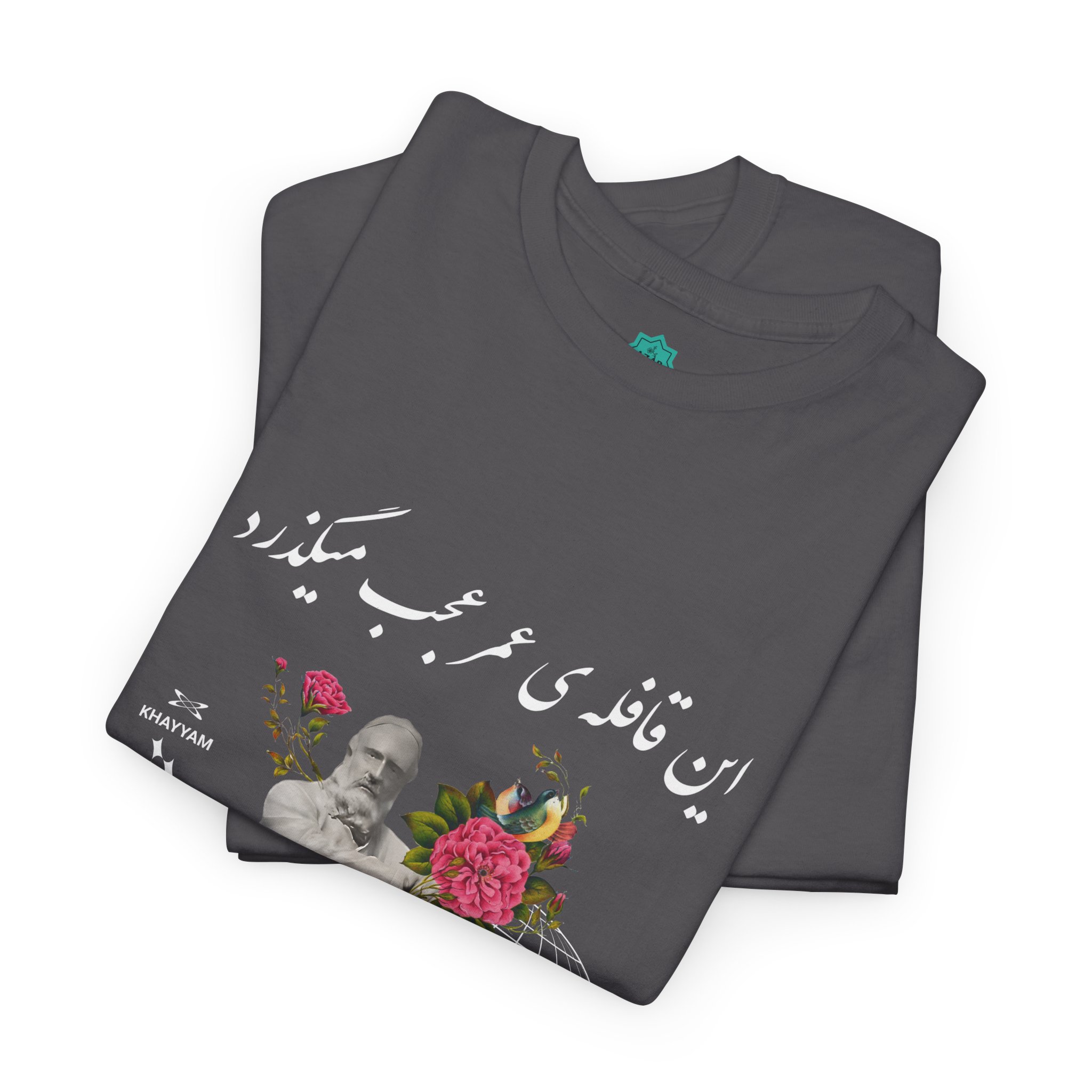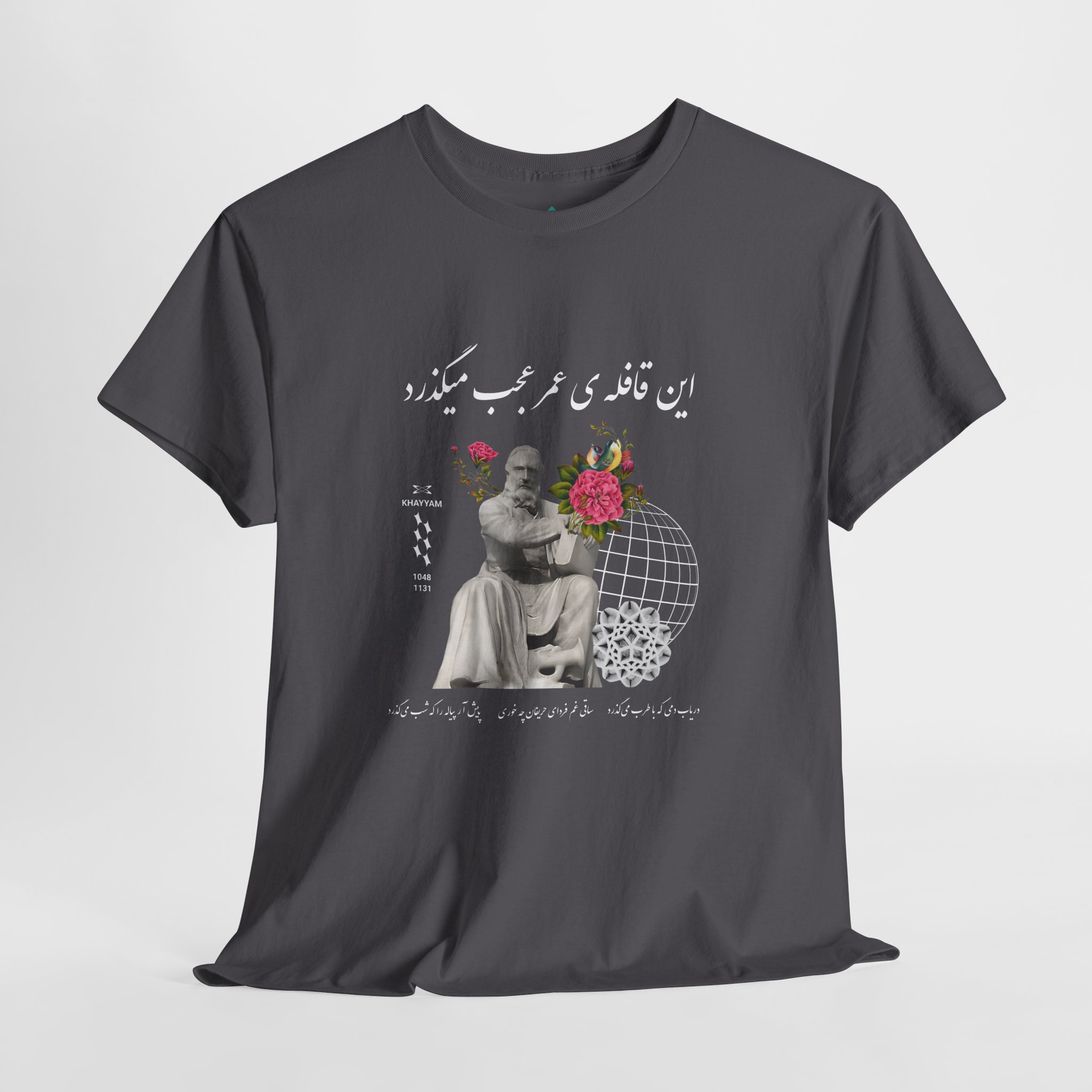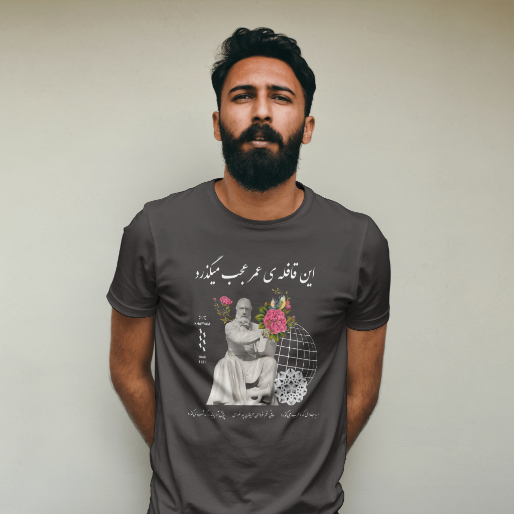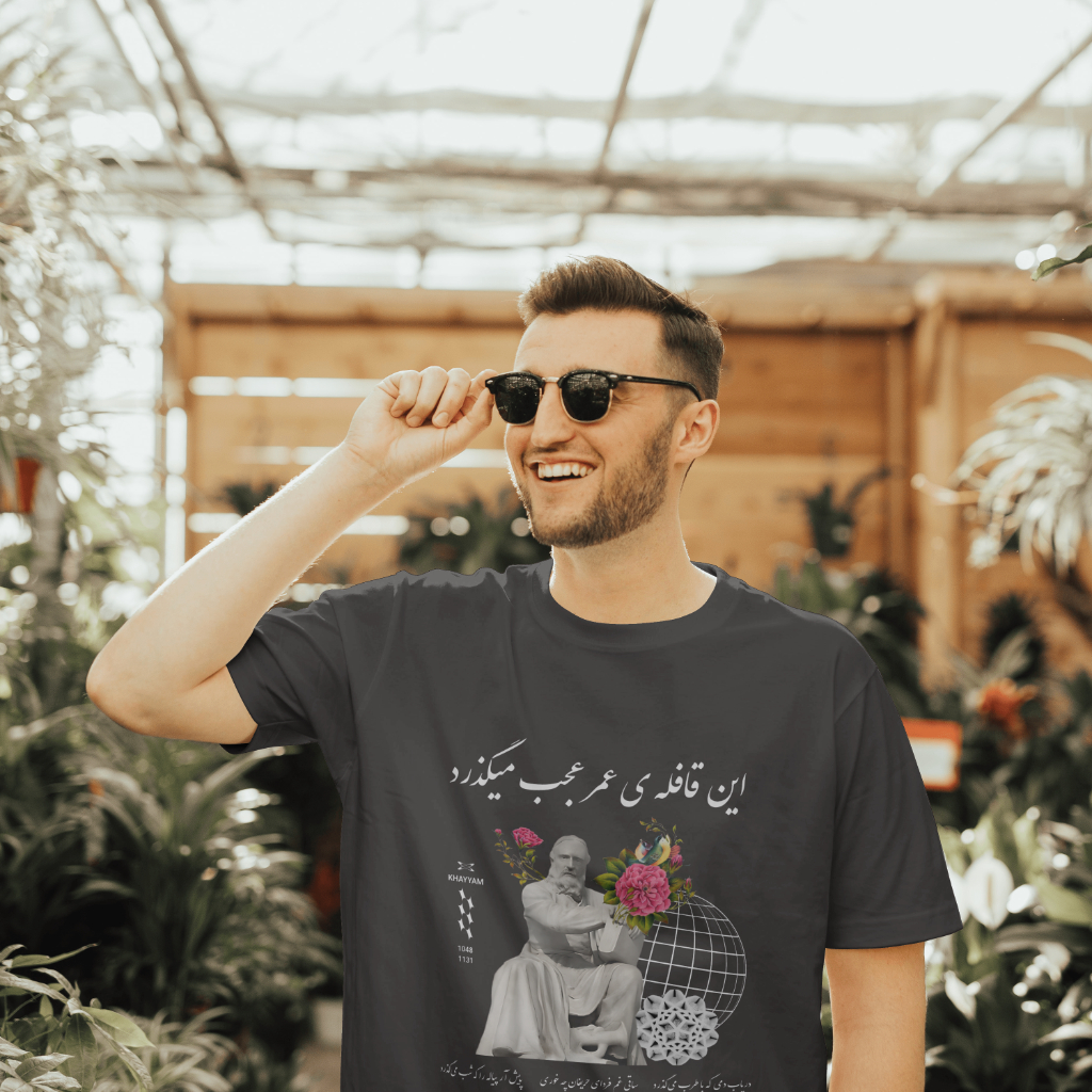 The Charcoal Khayyam Design T-shirt exudes a classic and timeless vibe. It is suitable for casual and semi-formal occasions. Made with medium fabric and a ribbed knit collar, this tee ensures year-round comfort and retains shape. It is perfect for adults and is ideal for sustainable and durable clothing.