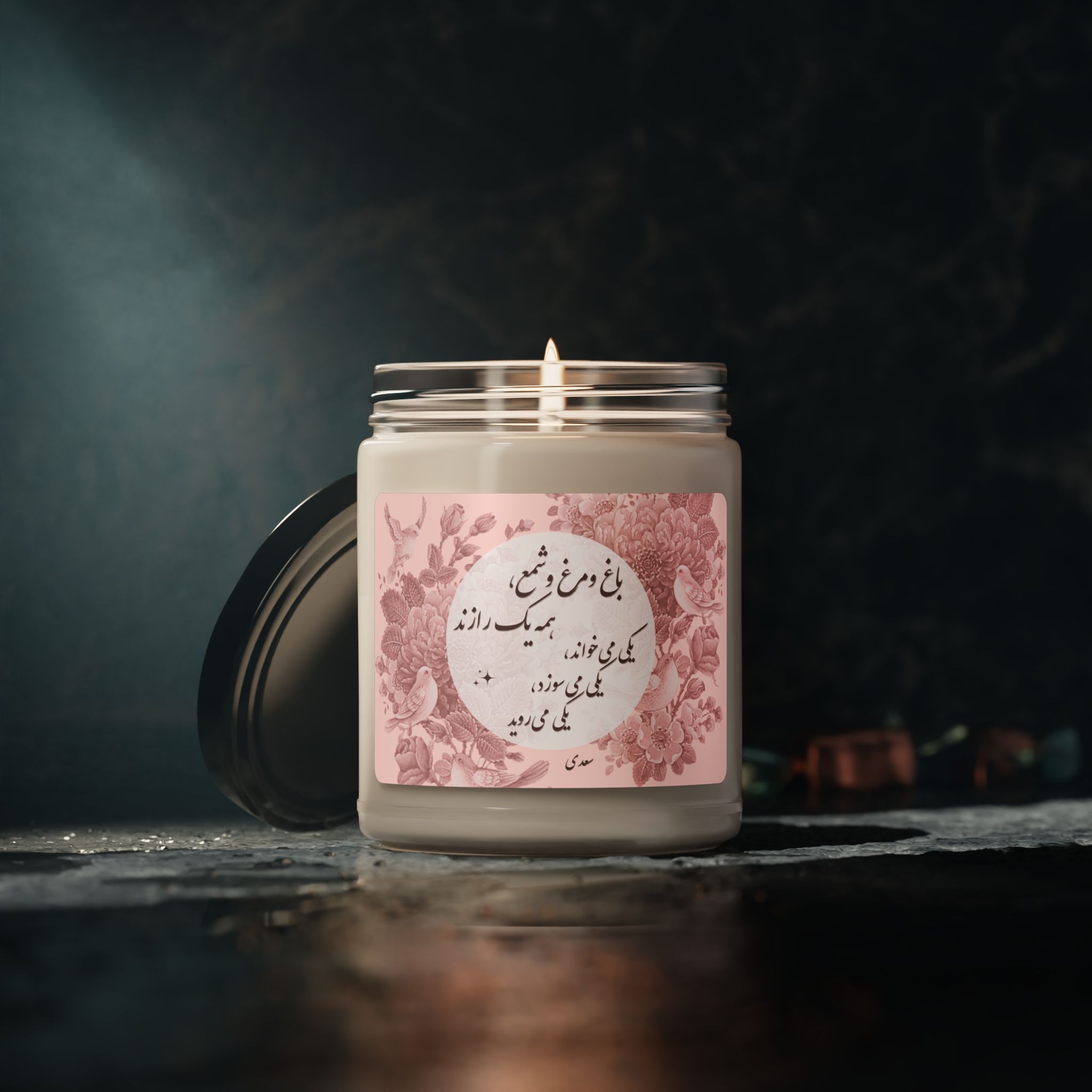 Care instructions: Keep the candle burning within sight, away from children and pets, and never near flammable items.